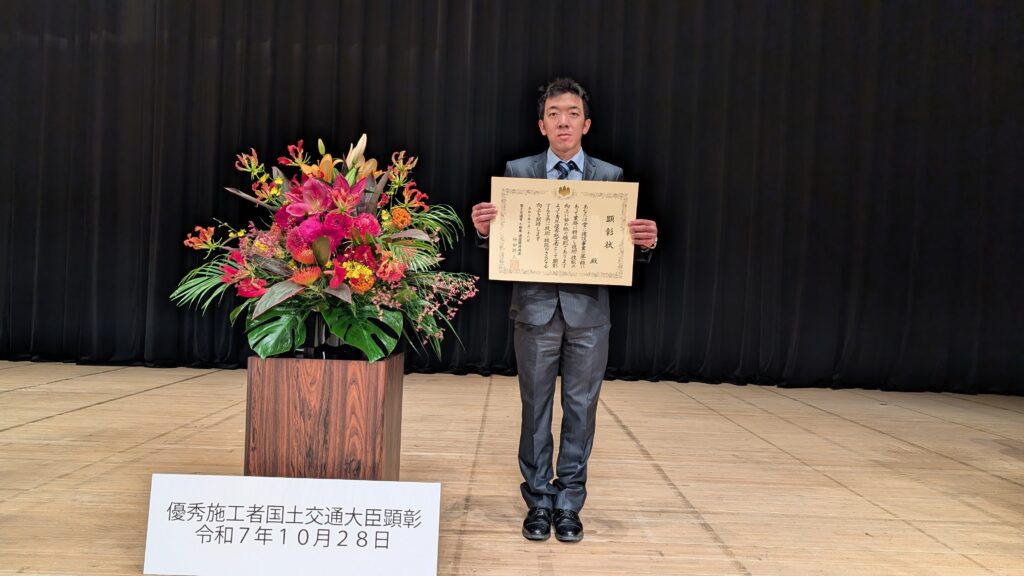 令和7年10月28日、文京シビックホール(東京都)で開催された「令和7年度優秀施工者国土交通大臣顕彰式典」において、弊社社員が建設経済局長から青年優秀施工者(建設ジュニアマスター)として表彰されました。